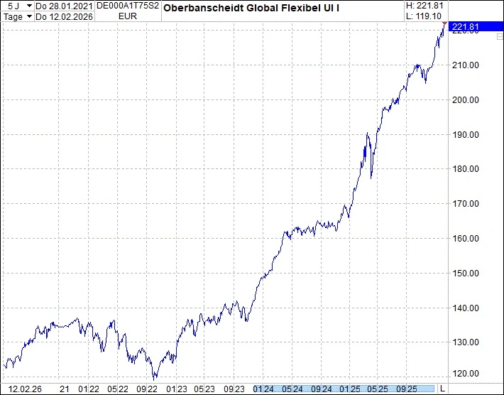 Der Oberbanscheidt Global Flexibel UI wird auch deshalb von Morningstar mit der Höchstnote von fünf Sternen klassifiziert, weil es dem Multi Asset-Fonds gelungen ist, mit einer vergleichsweise niedrigen Volatilität von 6,61 Prozent über drei Jahre ausgezeichnete Performanceergebnisse zu generieren. Die kumulierte Wertentwicklung von +63,99 Prozent über den jüngsten Dreijahreszeitraum, die einer Rendite p.a. von +17,92 Prozent entspricht, fällt genauso überzeugend aus wie die Fünfjahresperformance von +77,03 Prozent bzw. +12,10 Prozent jährlich. Auch im neuen Börsenjahr 2026 befindet sich der Oberbanscheidt Global Flexibel UI wieder voll auf Kurs: Allein seit dem 1. Januar sind Kursgewinne von +4,27 Prozent in Euro angefallen. Die hieraus resultierende Sharpe Ratio gegenüber dem risikolosen Dreimonatszins in Euro ist mit 2,24 sehr hoch und würde manchem reinen Aktienfonds zur Ehre gereichen – hier wird diese attraktive Performance jedoch mit einem aus Anleihen- und Aktieninvestments kombinierten Portfolio erreicht.