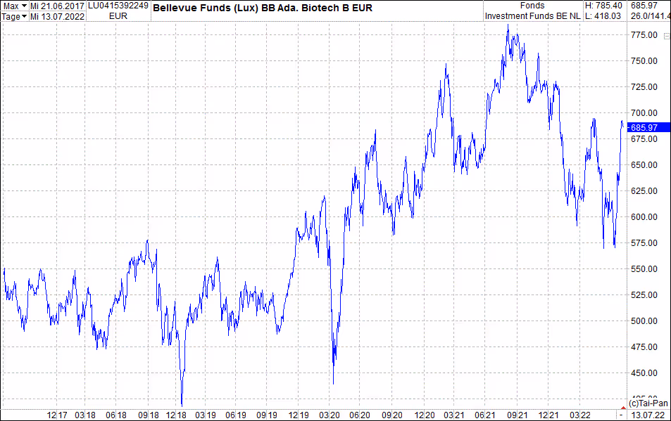 Wodurch gelang es dem Biotech-Fonds, sich von den durch Inflation, Ukraine-Krieg und Rezessionsängsten geplagten Märkten abzukoppeln? Nun, mit dem Ende des 2. Quartals richtete sich der Fokus der Investoren wieder auf die Unternehmensnachrichten aus der Biotechnologie, und diese fielen rundherum überzeugend aus. Mit der Übernahme der auf Krebsforschung spezialisierten Turning Point Therapeutics durch Bristol-Myers startete der Biotech-Sektor fulminant in den Monat. Bristol-Myers zahlte für den Krebsspezialisten einen Aufpreis von 122 Prozent auf den Aktienkurs, so dass sich das Gesamtvolumen des Deals auf 4,1 Milliarden US-Dollar belief.