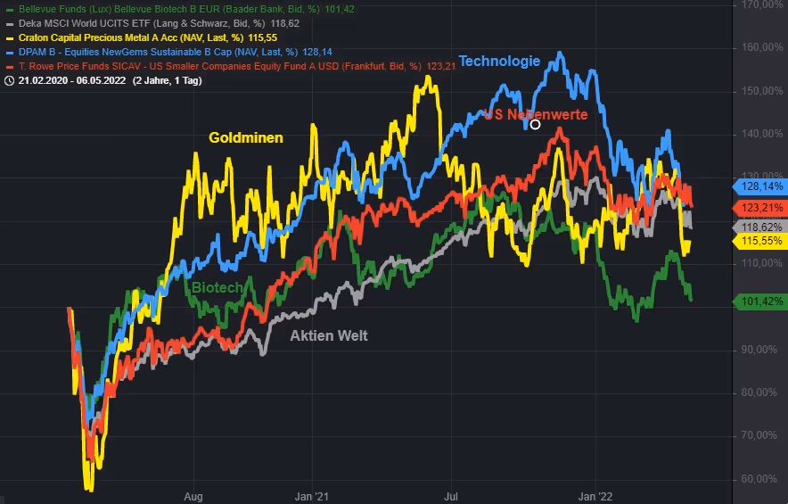 Und nebenbei gab es ja auch noch Börse. Langweilig war es auch in der vergangenen Woche nicht, insbesondere der Zinsanstieg in den USA und in UK haben nochmal für Bewegung gesorgt. Zu sehen ist das auf unserem gewohnten Chart mit den spannendsten FondsIdeen der Strategie SJB Surplus.