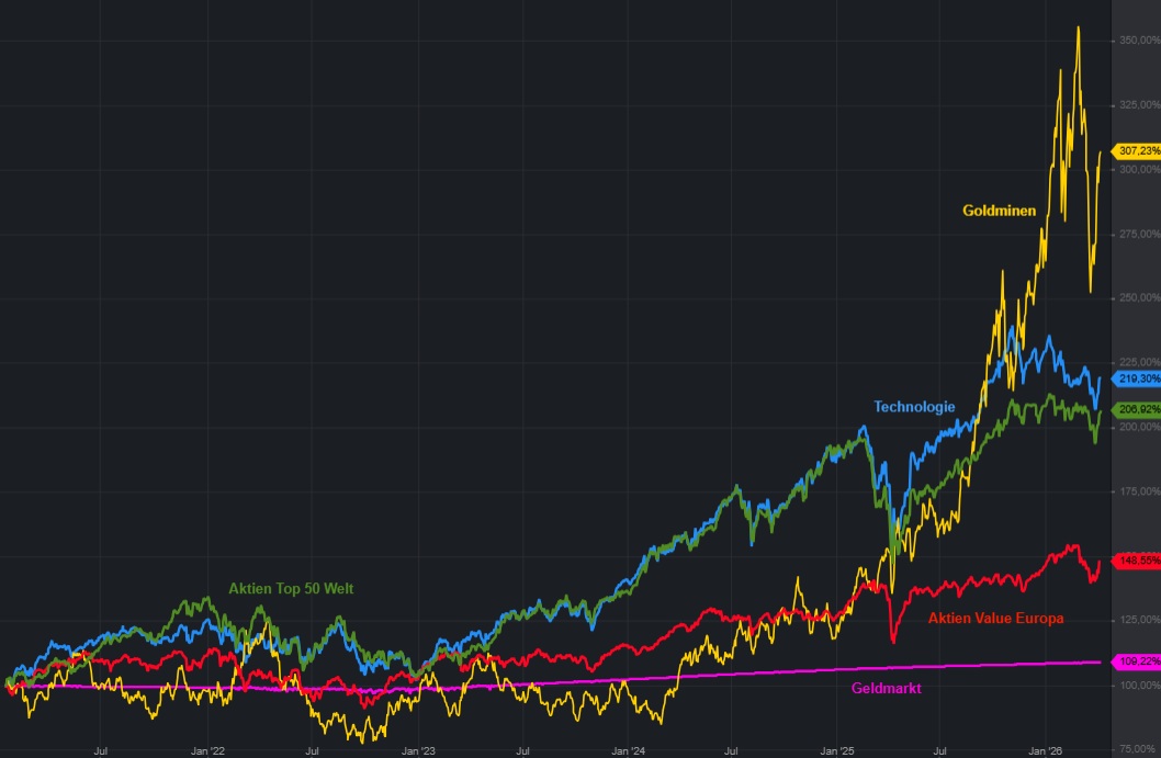 Solange der Krisenmodus anhält, bleiben aber auchandere Rohstoffe und Gold recht hoch gewichtet im Portfolio. Dazu braucht esnicht mal den Hinweis auf das goldene Haar der Lorelei.