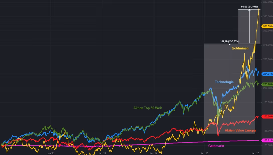 Durch den Streit um Grönland ist aber nicht nur das politische Vertrauen erschüttert, auch die Bereitschaft des Westens, den Ami-Bierdeckel immer wieder zu übernehmen, ist dahin. Zuletzt erklärte Dänemark, alle US-Schuldscheine verkaufen zu wollen. Ist nicht viel, aber das Signal reichte aus, um kurzfristig die US-Anleihen ordentlich unter Druck zu setzen. Wenn dann noch Japan Probleme mit der Finanzierung seines Schulden-Fuji bekommt, fällt halt mehr als ein Sack Reis um. Was bleibt also als sicherer Hafen. Bingo!