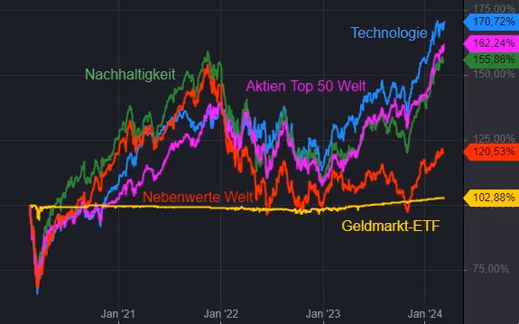Weil aber jede Party mal vorbei ist und dann nur zu oft Schnittchen übrig bleiben, haben wir zuletzt angefangen, die Gewinne der letzten Wochen zu realisieren: Ganz vorsichtig und behutsam in kleinen Chargen und ja nicht zu dolle. Als Tupperdose dienen dabei Geldmarkt-ETFs, die halten die Gewinne bei einer Verzinsung von aktuell über 3,5% bis zur nächsten Party frisch. Und die kommt bestimmt, auch wenn es mal etwas verkatert runtergehen sollte.