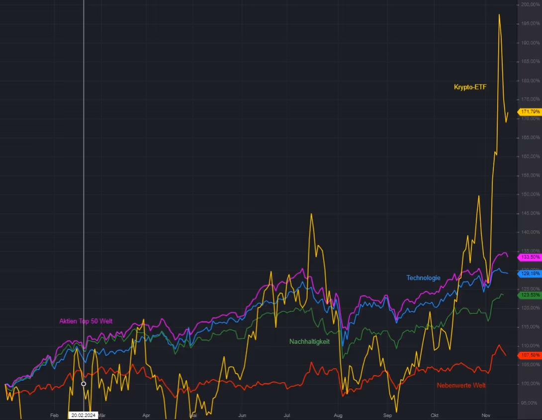 Wieviel Yihaaaaa! das genau war, erkennt man an der Entwicklung des Krypto-ETFs, den wir seit Februar in der Strategie SJB Surplus haben. Kurz nach der Wahl haben wir hier nochmal zugekauft und sind nun dabei, Gewinnmitnahmen zu realisieren. Die Linien unten sind dann übrigens alles andere, mitunter auch Tesla-Aktien.